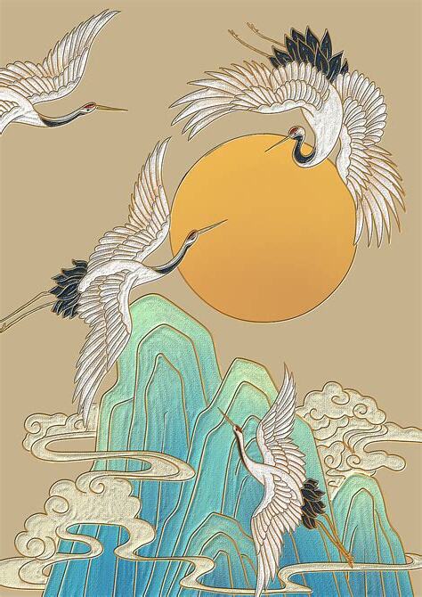 仙鶴在中國傳統藝術中經常出現。在書畫作品中,仙鶴常與松樹、祥雲等元素一同描繪,寓意著長壽安康。此外,鶴舞也被視為吉祥喜慶的舞蹈,在戲曲、舞蹈等表演中常見。