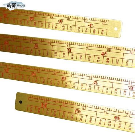 注意,魯班尺上下兩個部分千萬不要搞錯!魯班尺的上半部為文公尺,用於量度陽宅、神位、佛具尺寸;下半部為丁蘭尺,多用於陰宅、祖先牌位;而尺上的文字,紅色為吉,黑色為兇。文公尺上分為八個大字:「財、病、離、義、官、劫、害、本」。