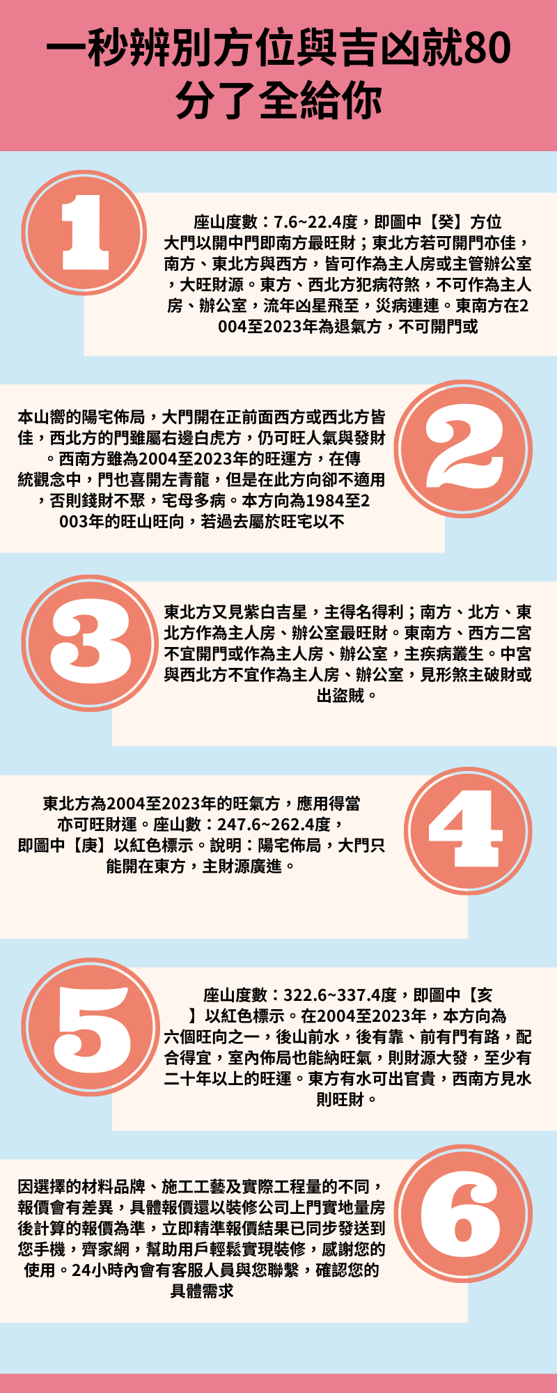南方未來2024年方,若大門開在南方,明堂且無形煞,財。西方2024年後屬退氣,若見形煞主婦女多災病,所以不要作為大門或主人房。