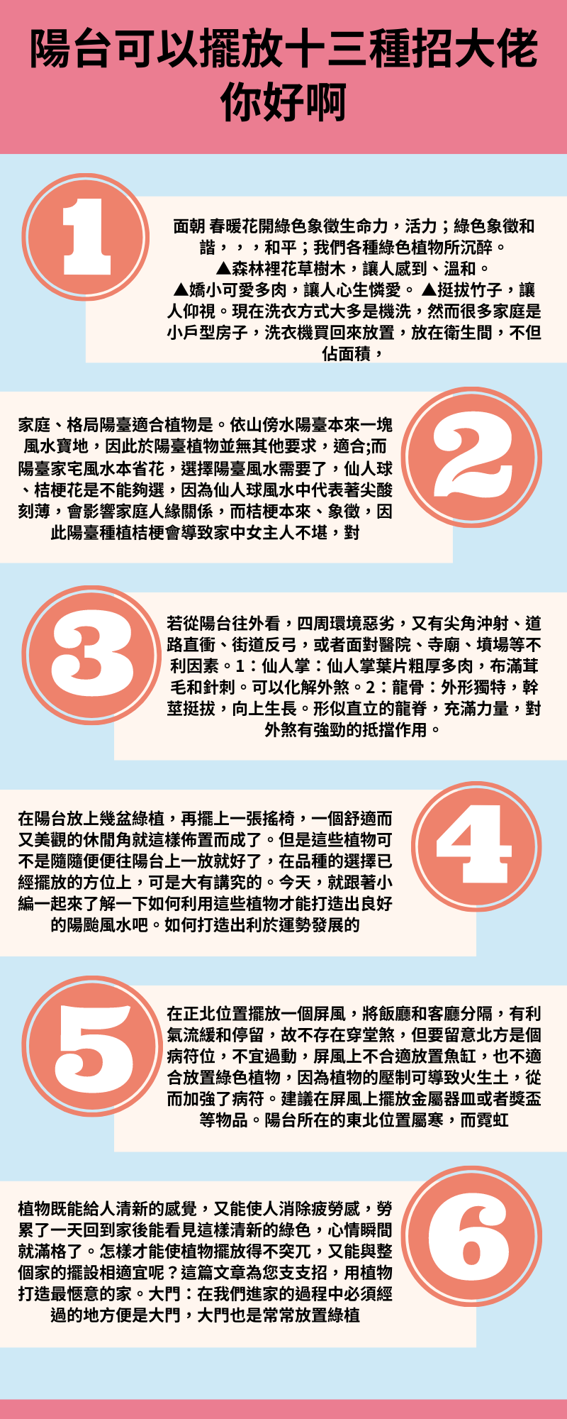 陽台放上幾盆植,擺上一張搖椅,一個而休閒角這佈置而成了。但是這些植物可不是隨陽台上一放了,品種選擇擺放方位上,可是大有講究。今天,跟著編一起來了解一下如何利用這些植物才能打造出陽颱風水吧。如何打造出利於運勢發展陽颱風水?