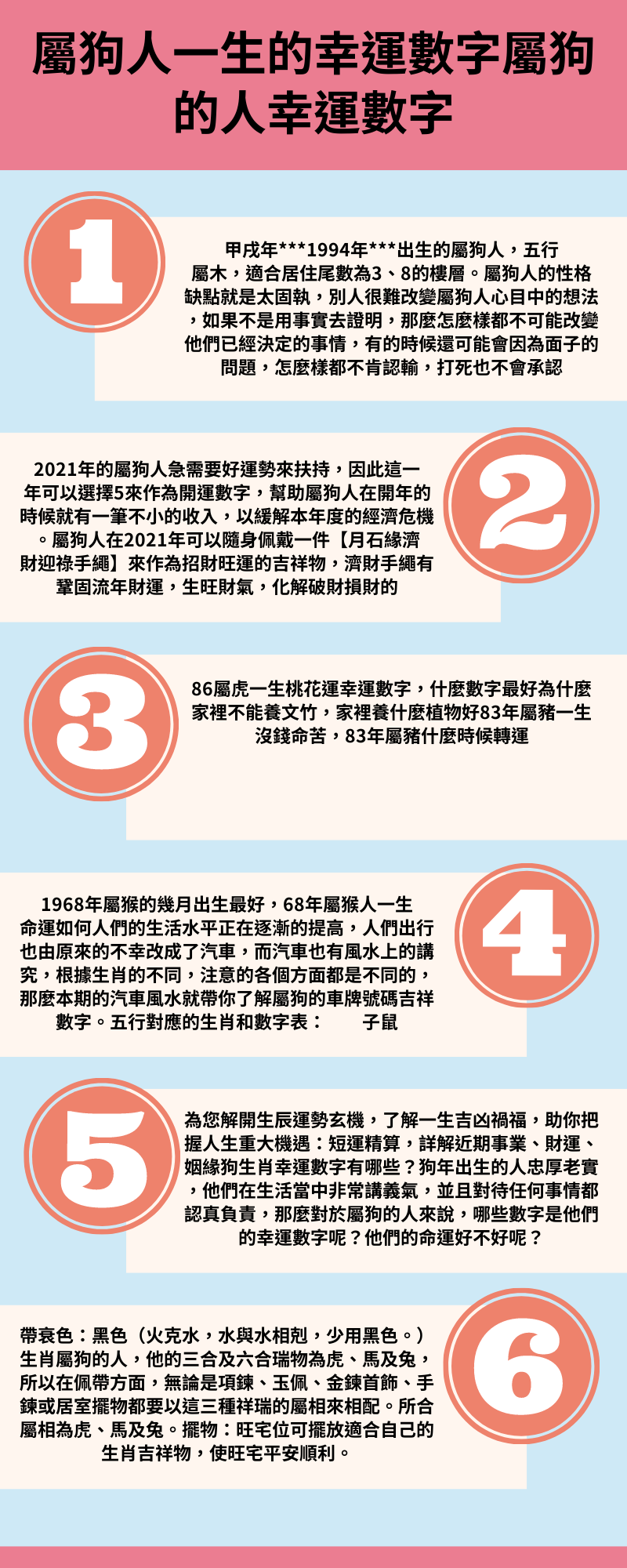 生於壬戌年(1922年、1982年)屬狗人,五行屬水,他們數字是1、6。