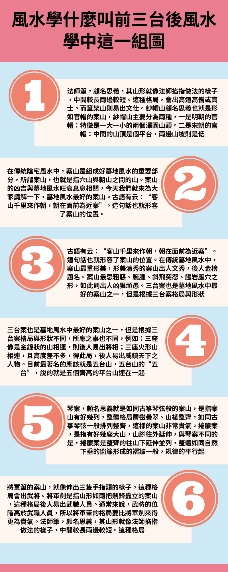 三台案是墓地風水中案山之一,但是三台案格局形狀,所應事,例如:三座像是金鐘狀山相,後人易出相;三座火形山相,且高度差不多,得此局,後人易出威鎮天下人物。