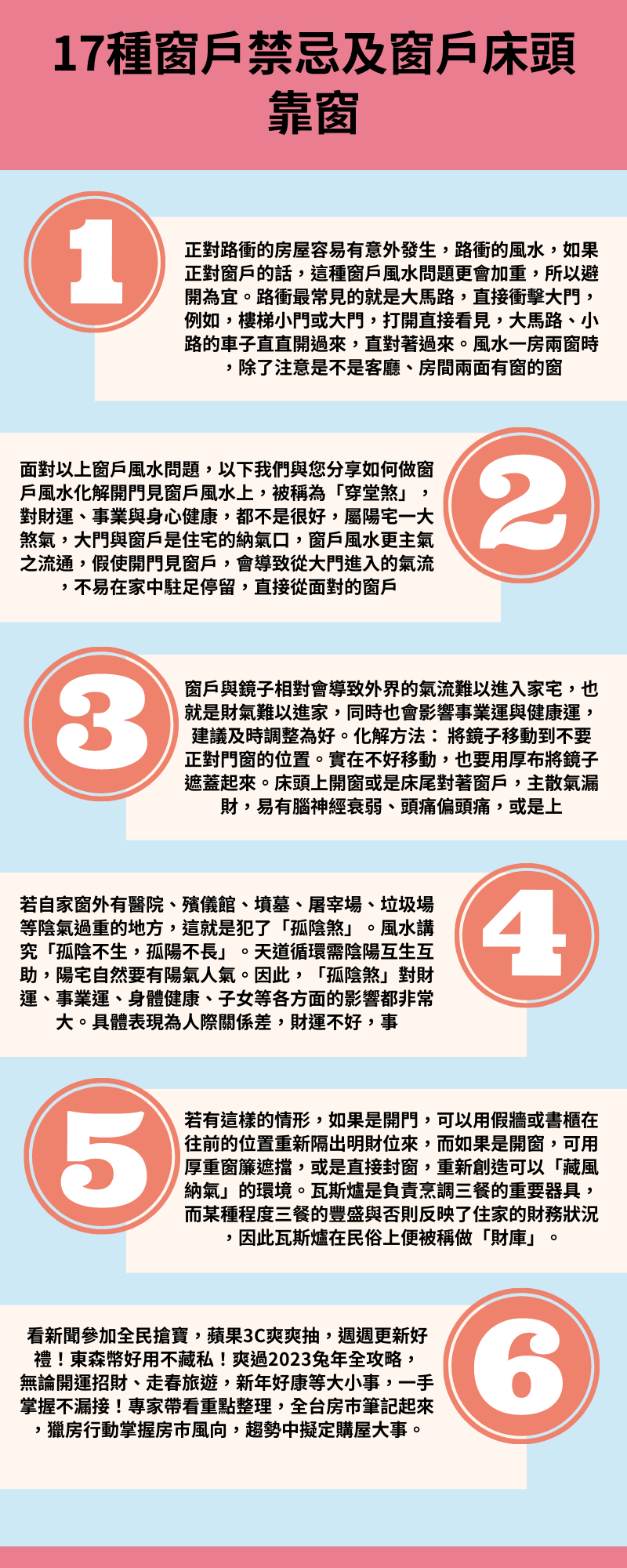 不過1個空間開2扇窗於運勢可能會有影響,經風水老師高煜霖表示,這樣規劃犯「桃花沖」、「貴人藏」、「命」、「家運弱」風水禁忌。高煜霖指出,1面牆如果有2面窗會形成「哭字牆」,做事收割成果,或是「做到流汗嫌到流涎」概念。