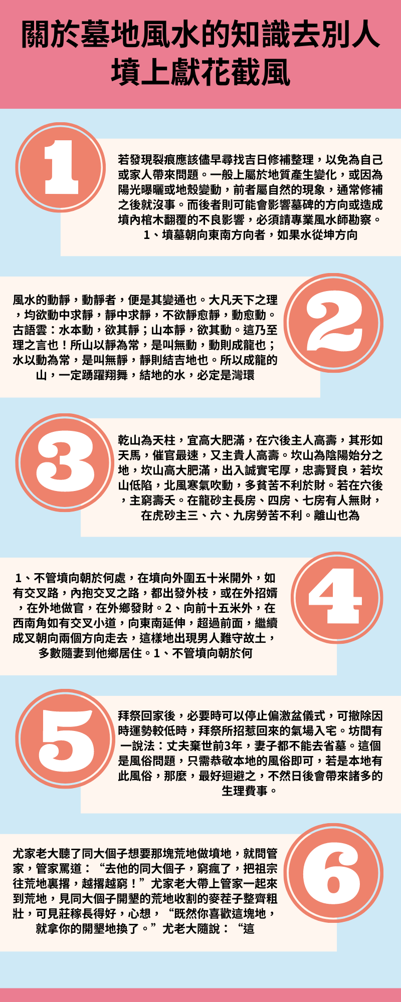 1、墳墓口不管準何方,向前要有十五六十米平地吉,如果三五米出短命夭亡人。墳前地長吉,滿平大吉。詩曰:墳前要有三步合,家中定能出秀才。