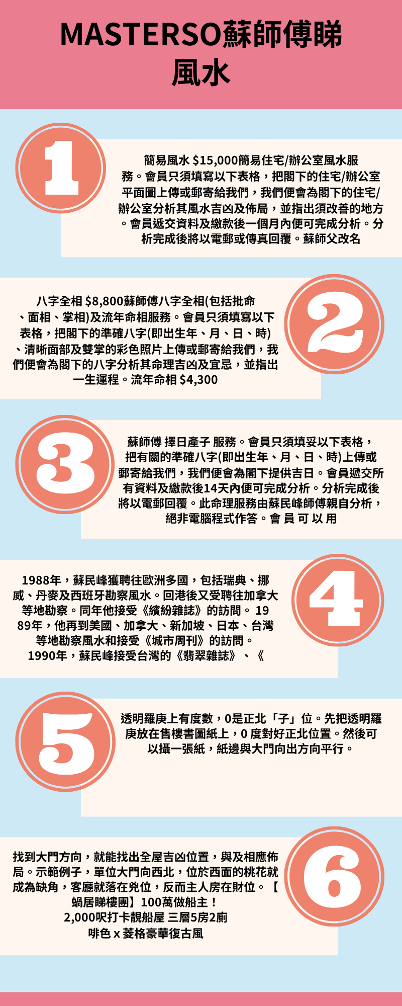 蘇師傅八字全相(包括批命、面相、掌相)及流年命相服務。會員填寫以下表格,閣下八字(即出生年、月、日、時)、面部及雙掌彩色照片上傳或郵寄我們,我們會閣下八字分析其命理吉凶及宜忌,並指出一生運程。