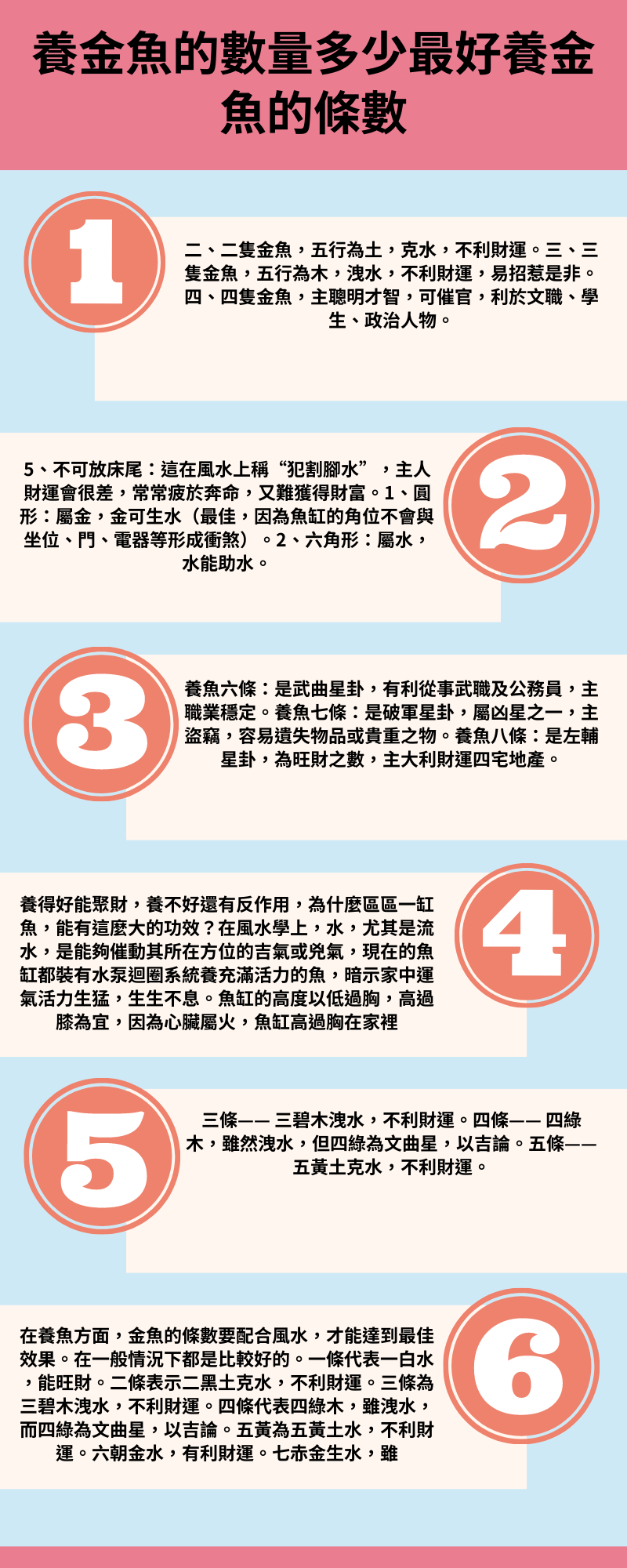 養魚數目搭配九星吉數,一、六、八、九數目或一、六、八、九尾數,可一條一種顏色,配六條其它顏色,或六條一種顏色,配八條其它顏色。魚數目運氣影響倒不是。